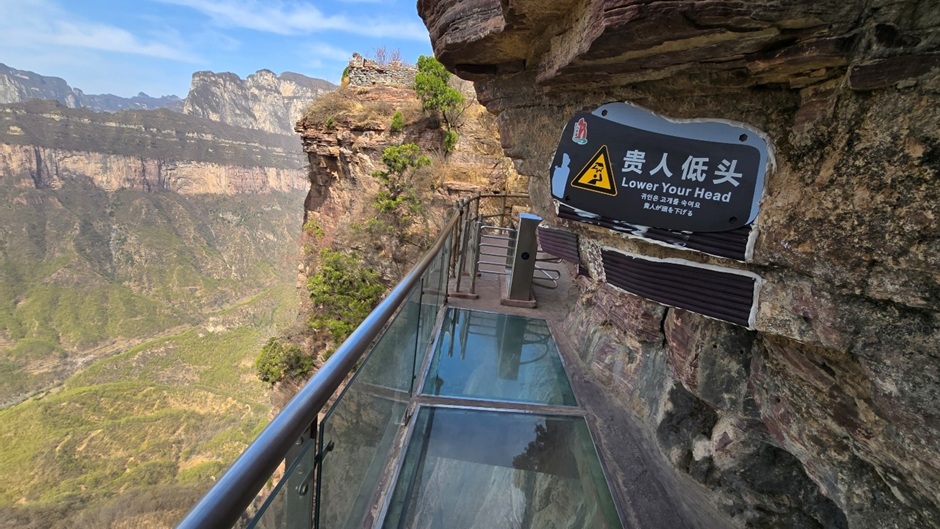 차에서 내려 걸을 때는, 수많은 잔도(棧道: 사람들이 걸어갈 수 있도록 만들어 놓은 절벽에 만들어진 다리 또는 좁은 길)를 따라 걷는다. 그 길은 바닥이 돌로 된 곳도 있고, 유리로 된 곳도 있다. 사실 이 잔도를 걸으면, 다른 사람이 나를 볼 때 위험하고 무서운 것이지, 걷는 사람은 별로 무섭지 않다. 그러나 이것은 앞을 보고 걸을 때의 일이다. 발 아래 유리를 바라본다면 기절초풍할 정도로 공포스럽다. 기절초풍이라고 하니, 비풍초 고스톱이 생각난다. 도대체 언제 해본 고스톱이냐?